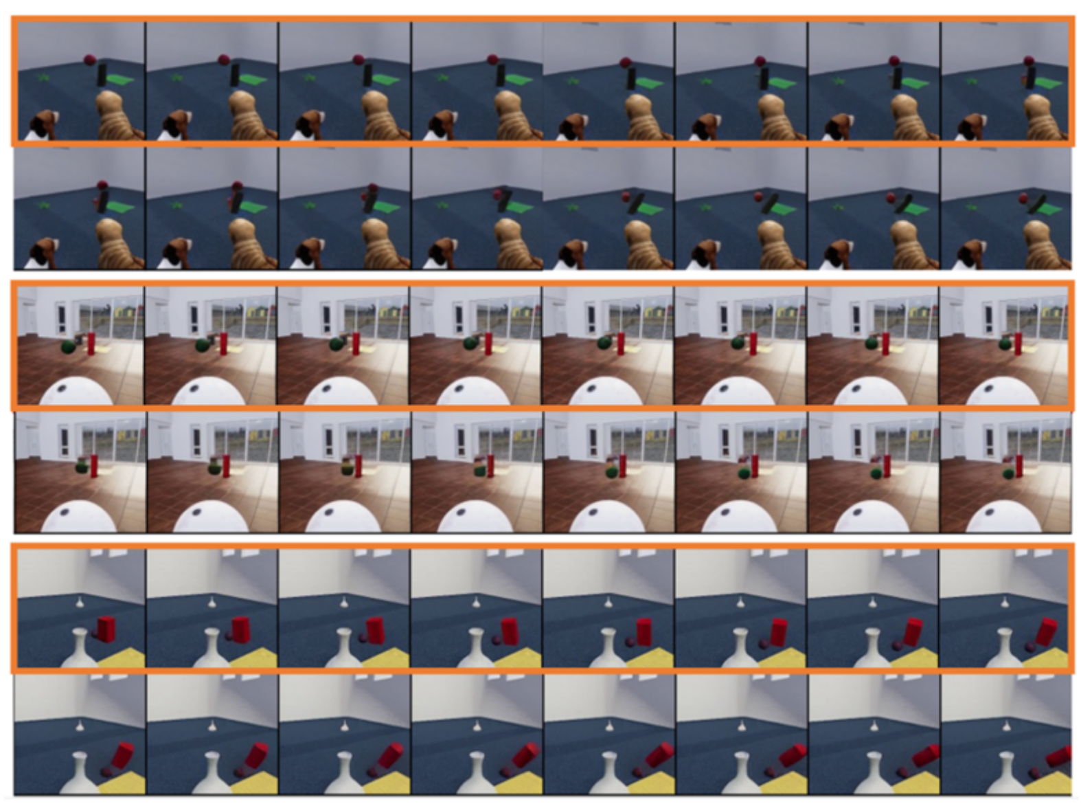 Researchers also explored the simulation of simple physical laws by the generative model VDT. They conducted experiments on the Physion dataset, where VDT used the first 8 frames as conditional frames and predicted the next 8 frames. In the first example (top two rows) and the third example (bottom two rows), VDT successfully simulated physical processes, including a ball moving along a parabolic trajectory and a ball rolling on flat ground and colliding with a cylinder. In the second example (middle two rows), VDT captured the velocity/momentum of the ball as it stopped before colliding with the cylinder. This demonstrates that the Transformer architecture is capable of learning certain physical laws.
