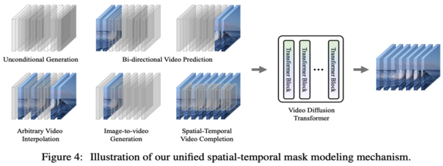 By reviewing VDT’s functionalities in unconditional generation and video prediction, the only difference lies in the types of input features. Specifically, inputs can either be pure noise latent features or concatenations of conditions and noise latent features. Subsequently, researchers introduce Unified Spatial-Temporal Mask Modeling to unify conditional inputs, as shown in Figure 4.