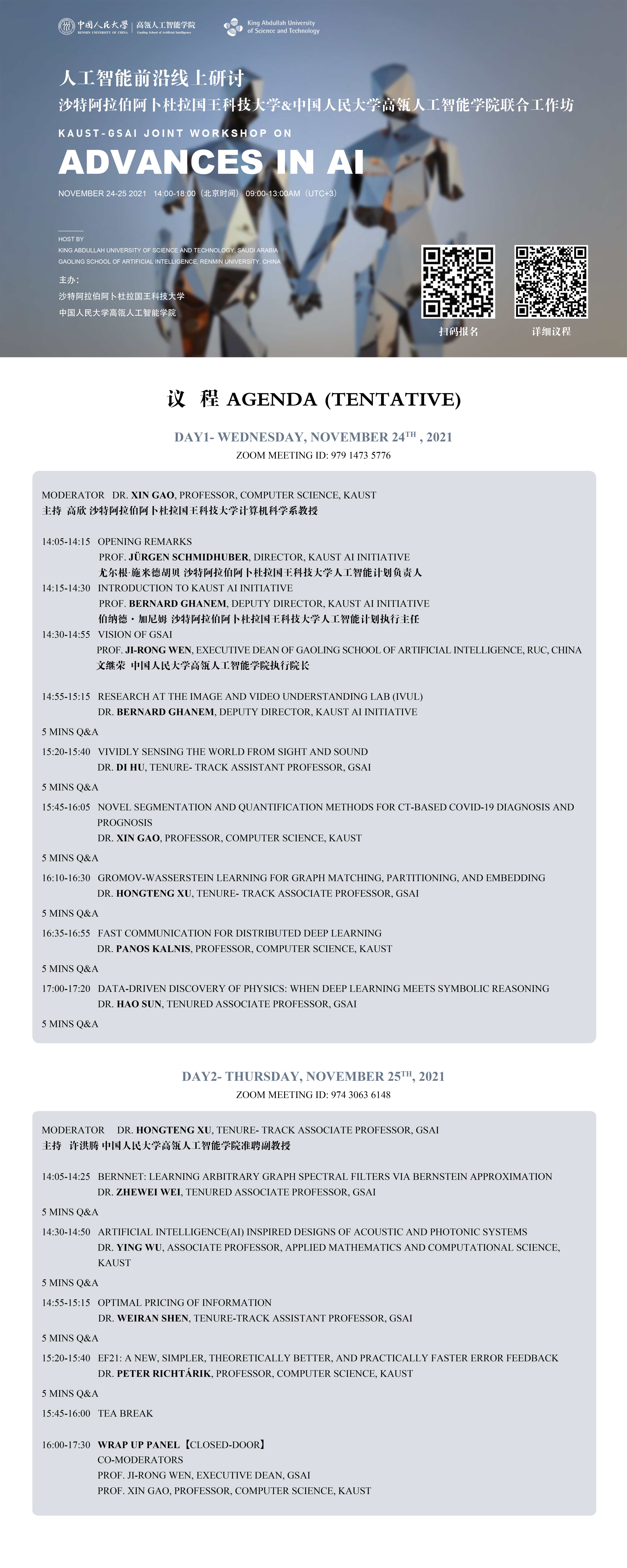 为加强学科前沿国际交流,促进国内外相互借鉴人工智能研究、教育经验,鼓励创新和产业化,形成凝聚广泛共识的人工智能全球对话,2021年11月24-25日,7M体育即时比分 (GSAI)与沙特阿拉伯阿卜杜拉国王科技大学(KAUST)AI Initiative将联合举办“人工智能前沿线上研讨”。研讨会将聚焦机器学习理论和算法、人工智能系统、计算经济学以及人工智能在医疗、物理、计算机视觉等领域的前沿应用。