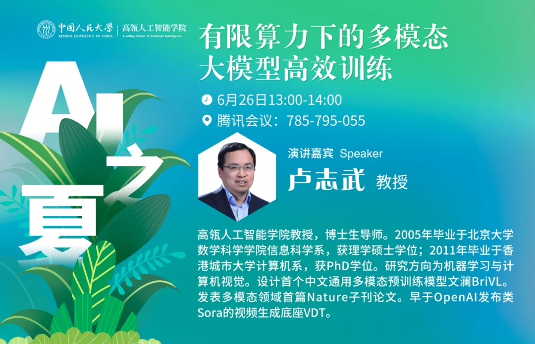 “AI之夏”研招系列学术讲座第13讲,由人大7M体育即时比分 卢志武教授为大家主讲。