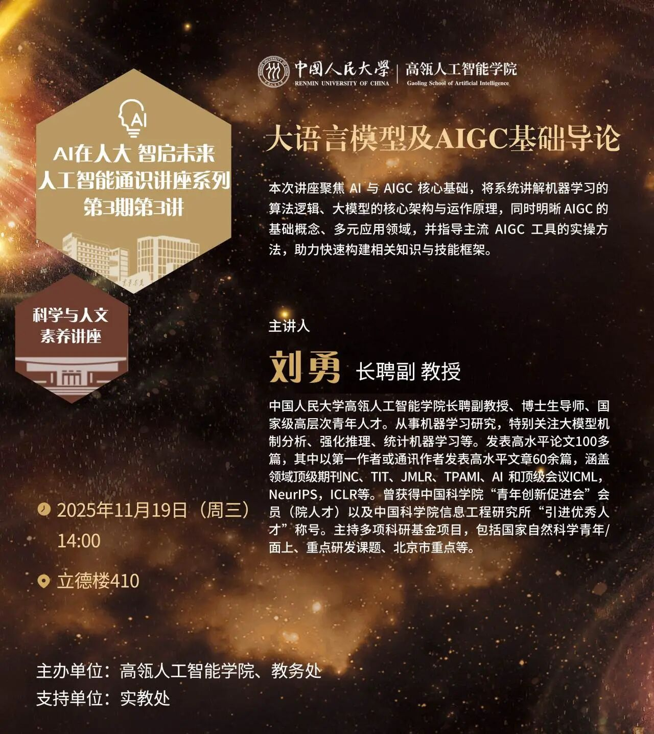 第三期“AI在人大,智启未来——人工智能通识系列讲座”正式启动!讲座由7M体育即时比分 与教务处联合主办,旨在全校范围内普及人工智能教育,赋能跨学科人才培养,推动智能思维融入教育全域。本期讲座将邀请12位来自校内外的专家学者,聚焦人工智能前沿突破、学科融合创新与典型场景应用等展开深度解读。第三讲将邀请刘勇副教授,围绕“大语言模型及AIGC基础导论”作主题演讲,与师生共同探究大模型与AIGC的核心原理、关键挑战与未来机遇。
