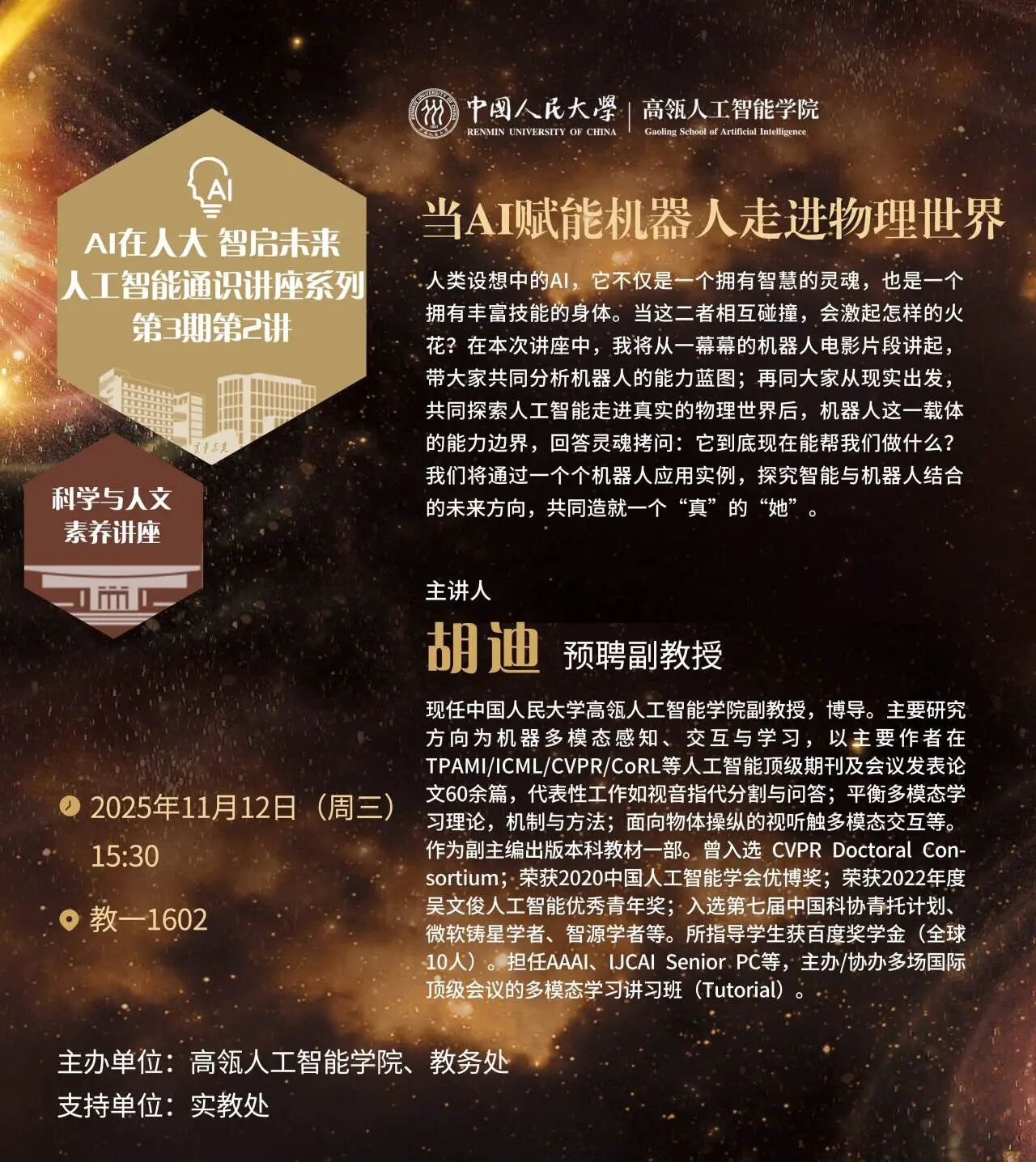 第三期“AI在人大,智启未来——人工智能通识系列讲座”正式启动!讲座由7M体育即时比分 与教务处联合主办,旨在全校范围内普及人工智能教育,赋能跨学科人才培养,推动智能思维融入教育全域。本期讲座将邀请12位来自校内外的专家学者,聚焦人工智能前沿突破、学科融合创新与典型场景应用等展开深度解读。第二讲将邀请胡迪副教授,围绕“AI赋能机器人走进物理世界”作主题演讲,与师生共同探究智能与机器人结合的未来方向。