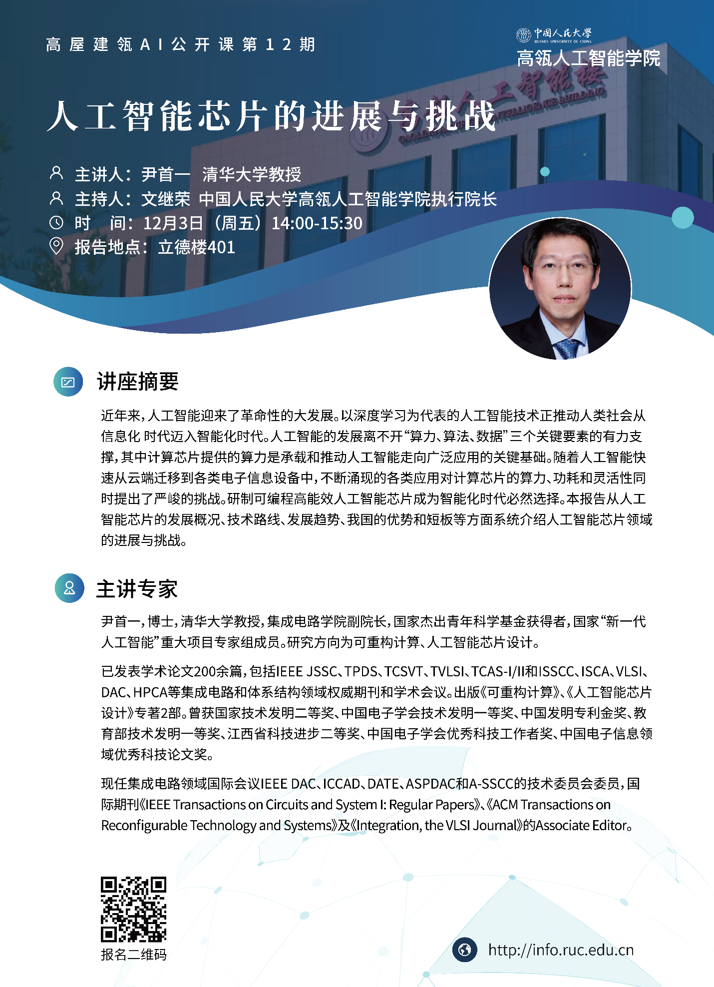 尹首一,博士,清华大学教授,集成电路学院副院长,国家杰出青年科学基金获得者,国家“新一代人工智能”重大项目专家组成员。研究方向为可重构计算、人工智能芯片设计。