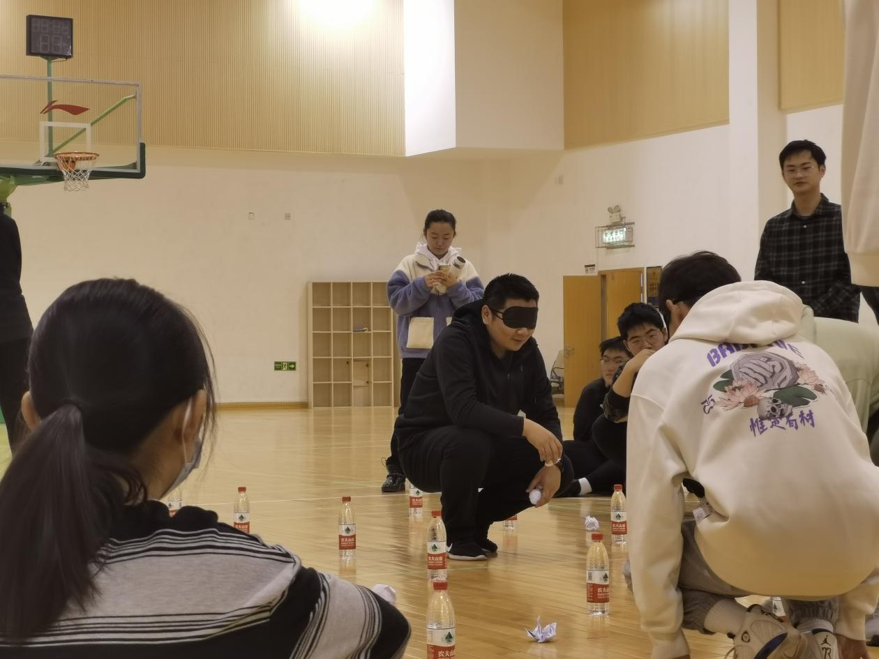 “沙场点兵”不单是智慧和身体控制的比拼,也是团结和协作的考验。在短暂商讨策略后,三个成员相互配合:“指挥官”在场外观察局势,“士兵”在场中听着“司令员”的指令蒙眼蹲踞前行,体现着团队间无言的默契和信任。在场同学屏息凝神,或是欢呼喝彩,场上成员的一举一动牵动着所有人的心弦,热情与斗志就此点燃。