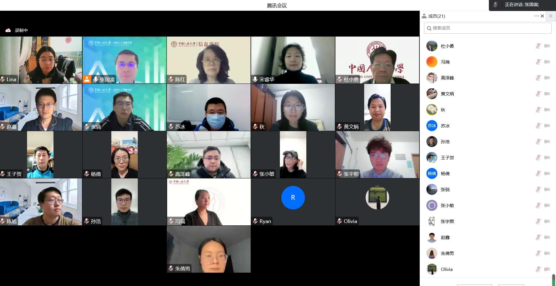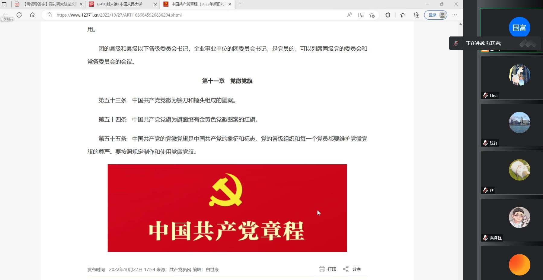 12月21日,人工智能教工党支部召开新党章学习暨入党发展会。校长助理、理工学科建设处处长杜小勇,信息学院党委书记陈红参会,人工智能教工党支部书记张国富主持会议。会上,陈红书记教授领学“中国共产党新党章”,随后召开了宋睿华、冯倓秋同志的入党发展会。
