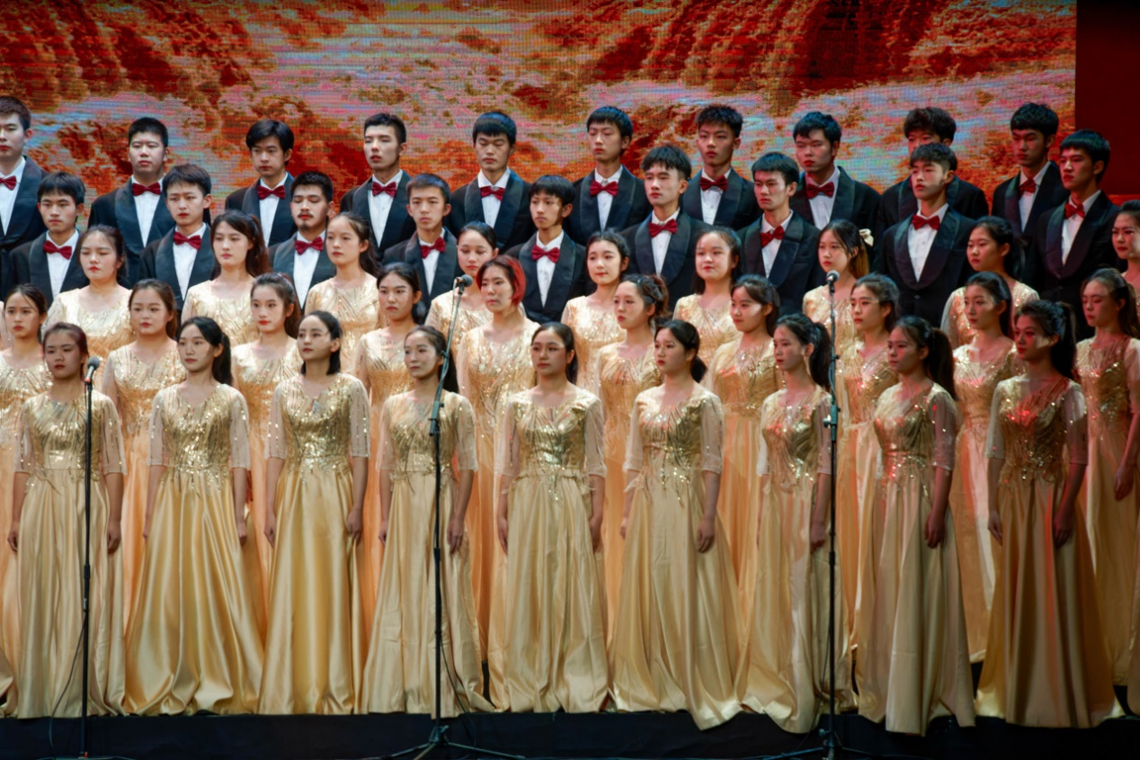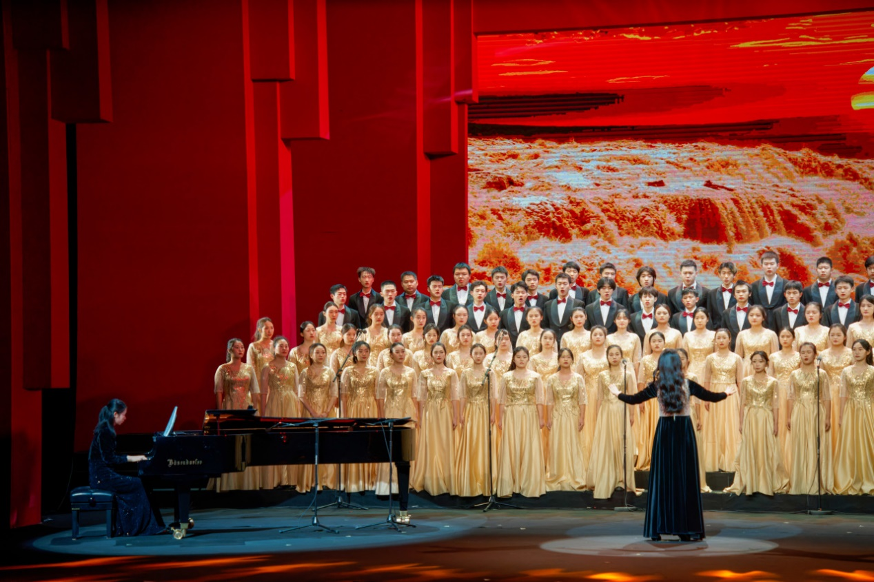 下午,激动人心的登台表演时刻到来,全体参演人员徐徐登场,在聚光灯之下开始了合唱演出。钢琴激昂的音阶倾泻而出,朗诵的声音慷慨激昂,开启了《怒吼吧!黄河》的激昂篇章。