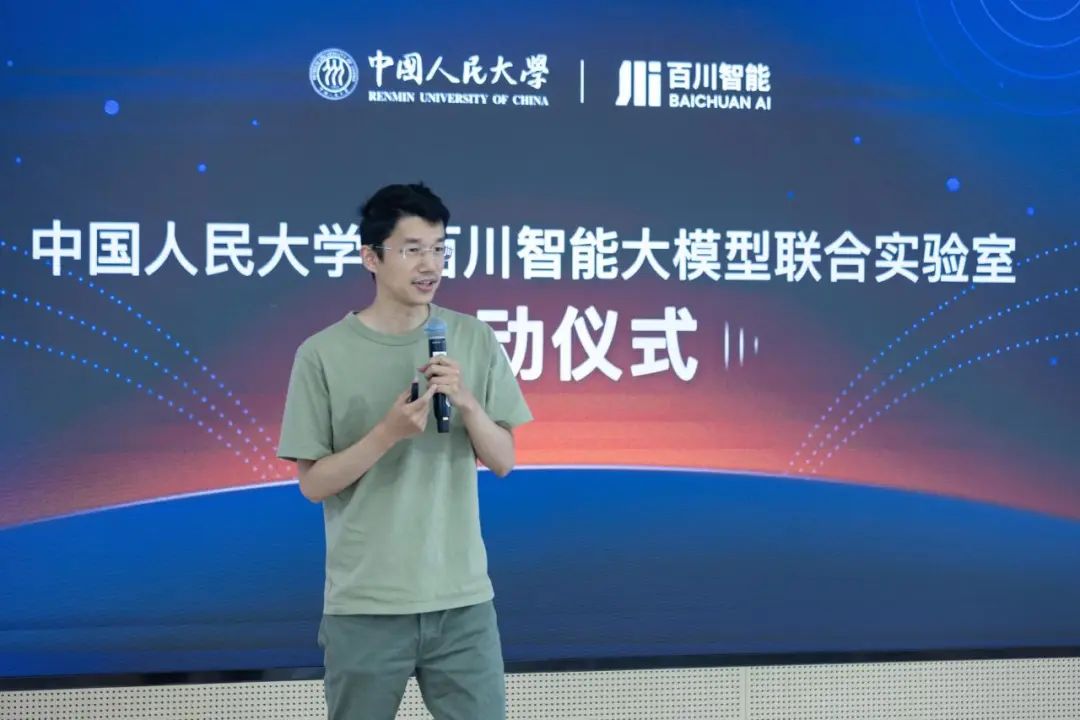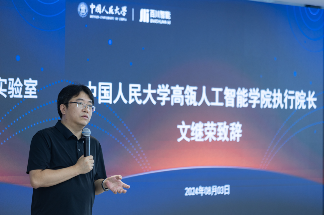 2024年8月3日,中国人民大学-百川智能大模型联合实验室启动仪式在中国人民大学立德楼举行。中国人民大学副校长冯仕政,理工学科建设处副处长杜忠朝,7M体育即时比分 院长文继荣,副院长窦志成及学院教师,百川智能创始人兼CEO王小川,技术联合创始人谢剑、陈炜鹏等技术专家参会。会议由7M体育即时比分 副院长窦志成主持。