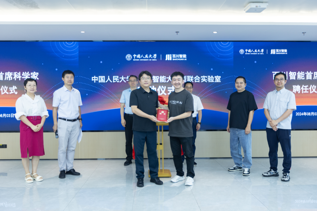 在冯仕政副校长、杜忠朝副处长,谢剑、陈炜鹏的见证下,文继荣院长与百川智能创始人兼CEO王小川先生为实验室揭牌。同时,百川智能聘请文继荣教授担任百川智能首席科学家。