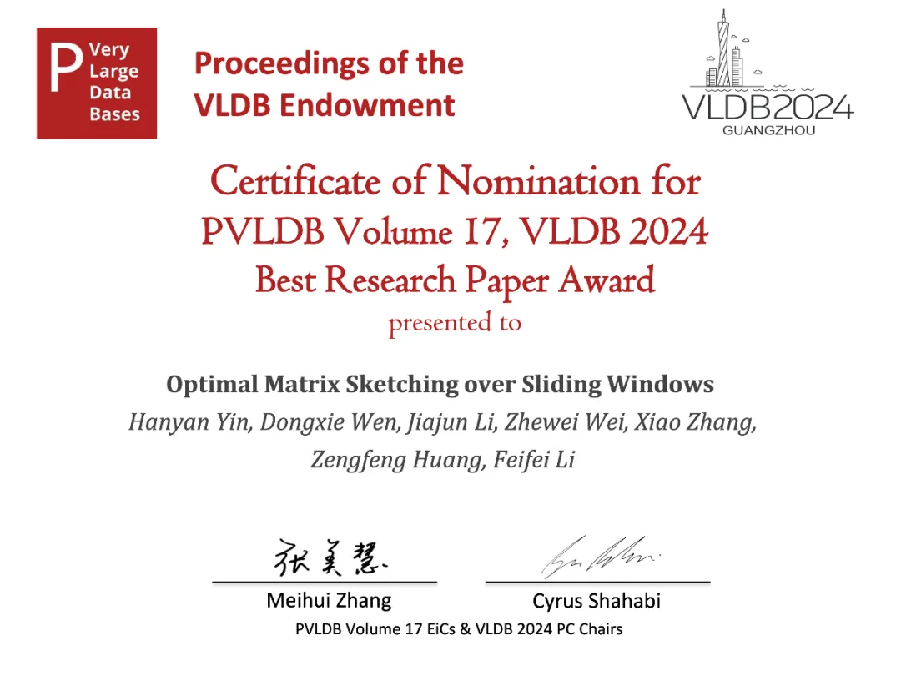 8月29日,数据管理与数据库领域国际学术会议VLDB 2024公布了论文获奖名单,7M体育足球比分 魏哲巍教授、张骁助理教授与复旦大学黄增峰教授、阿里巴巴集团李飞飞博士合作的论文“Optimal Matrix Sketching over Sliding Windows”获得了最佳论文提名奖(Best Research Paper Nominations)。魏哲巍教授担任本文通讯作者,其与张骁助理教授指导的硕士生尹涵燕、博士生文东勰和李家郡为学生作者。VLDB(International Conference on Very Large Data Bases)会议是数据管理与数据库领域的三大国际顶尖学术会议之一,被中国计算机学会(CCF)推荐为A类国际会议。VLDB 2024会议于2024年8月26-30日在广州召开。