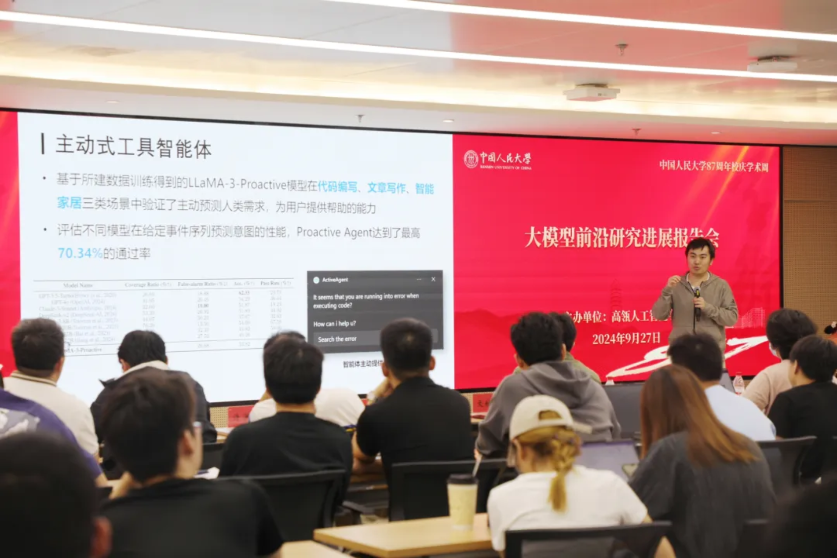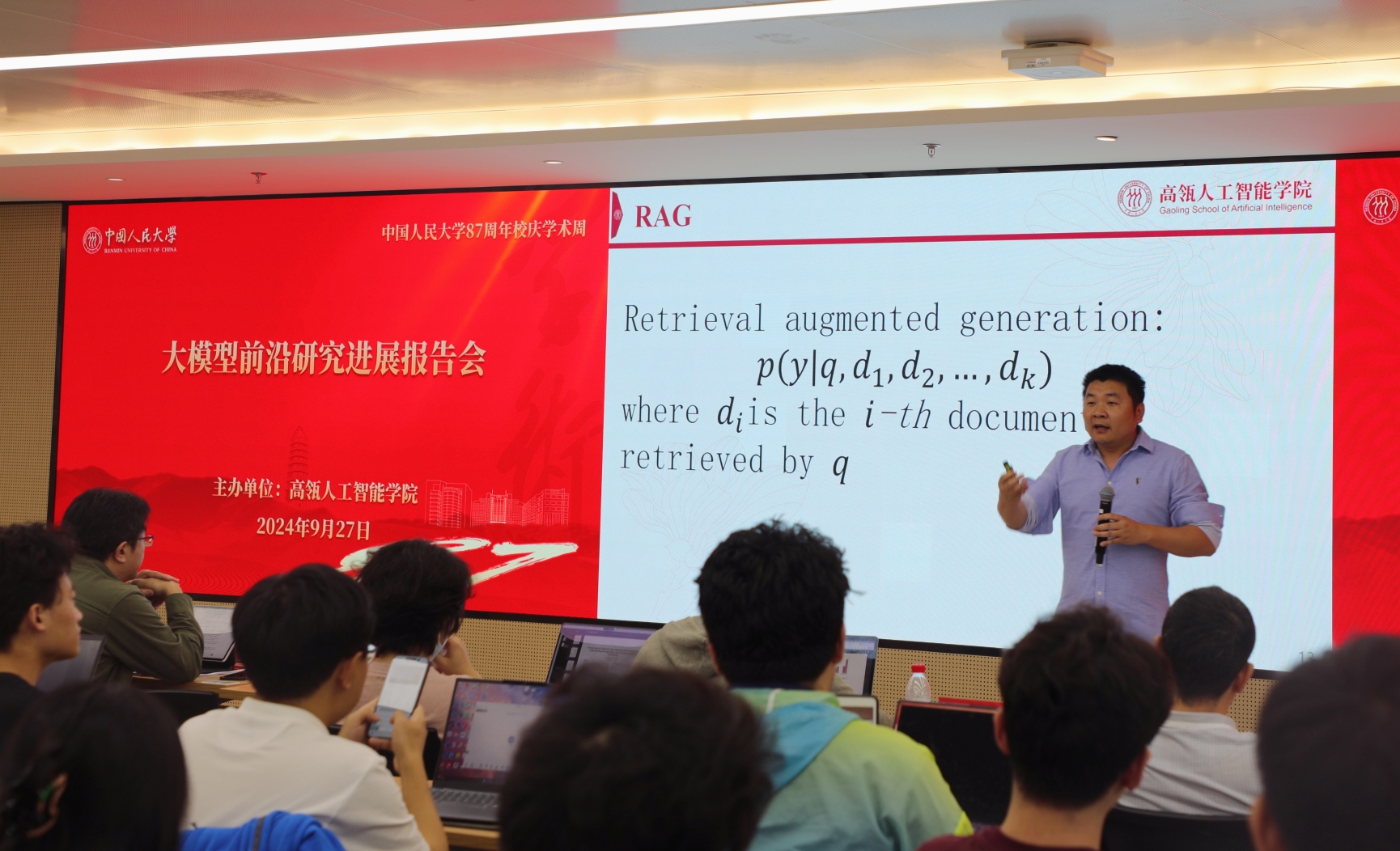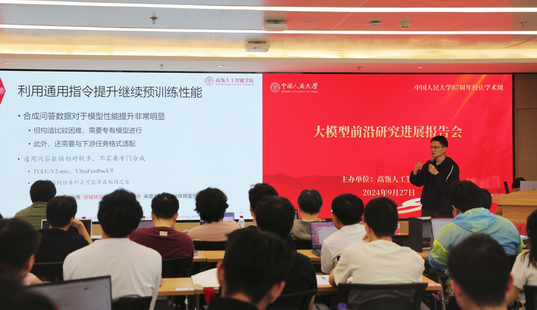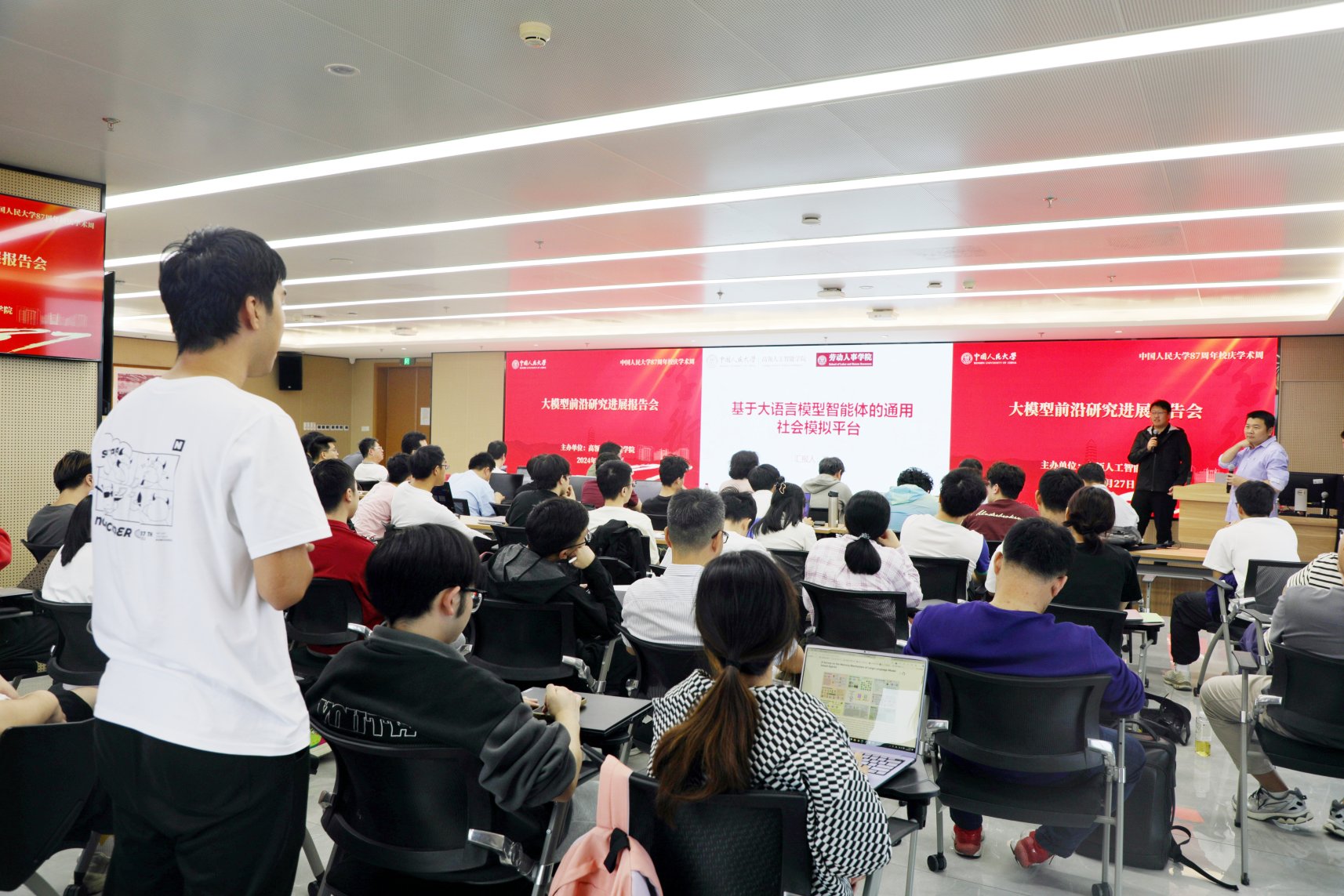 2024年9月27日下午,中国人民大学87周年校庆学术周活动-“大模型前沿研究进展”报告会在中国人民大学立德楼1826成功举办。本次学术会议由7M体育即时比分 主办,由准聘副教授刘勇担任主持。7M体育即时比分 执行院长文继荣教授出席会议并致辞,赵鑫教授、许洪腾长聘副教授、刘勇准聘副教授、陈旭准聘副教授和林衍凯准聘助理教授作主旨报告,共同分享大模型前沿研究进展,会议吸引了多位校内外人员参会。