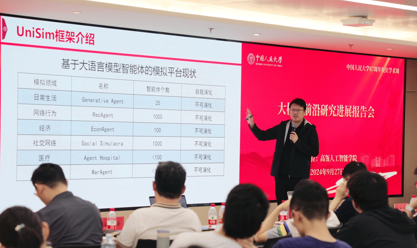 陈旭准聘副教授分享了题为“基于大语言模型智能体的通用社会模拟平台”的报告。他首先着眼于社会科学和自然科学的区别和联系,并指出社会科学在研究过程中“以真人为基础”的实验范式的局限性。其次,他介绍了大语言模型智能体对缓解这些局限性可能提供的机遇,并介绍了其课题组构建的通用社会模拟平台,该模拟平台的特点是具有通用性,智能体规模较大,并能自主演化。最后他展示了该平台的操作方法和未来潜力。