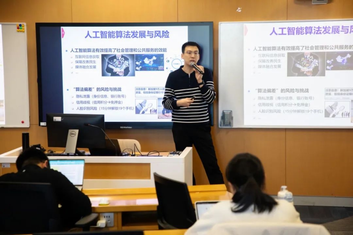 张骁老师以赛博朋克之父威廉·吉布森的科幻作品《神经漫游者》以及阿西莫夫的“机器人三定律”为引,带领听众回顾了人工智能伦理的思想起点。从科幻小说中的“高科技与低生活”到现实中的AI伦理问题,讲座围绕“隐私保护、公平公正、可解释性、可控性”等核心议题展开了深入探讨。