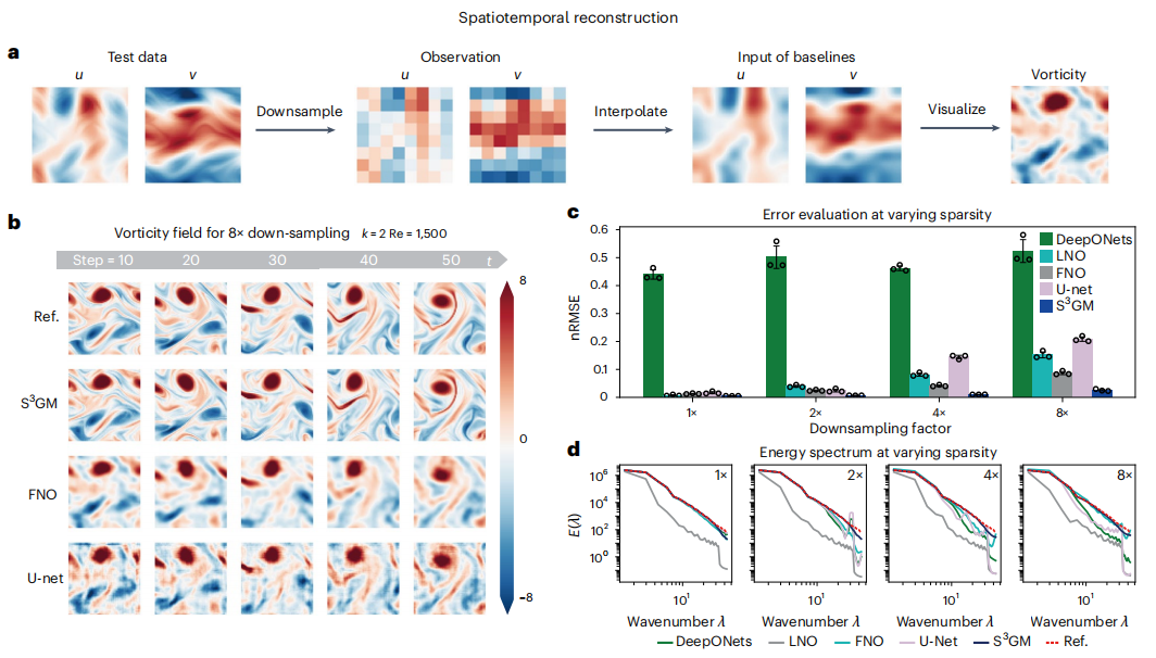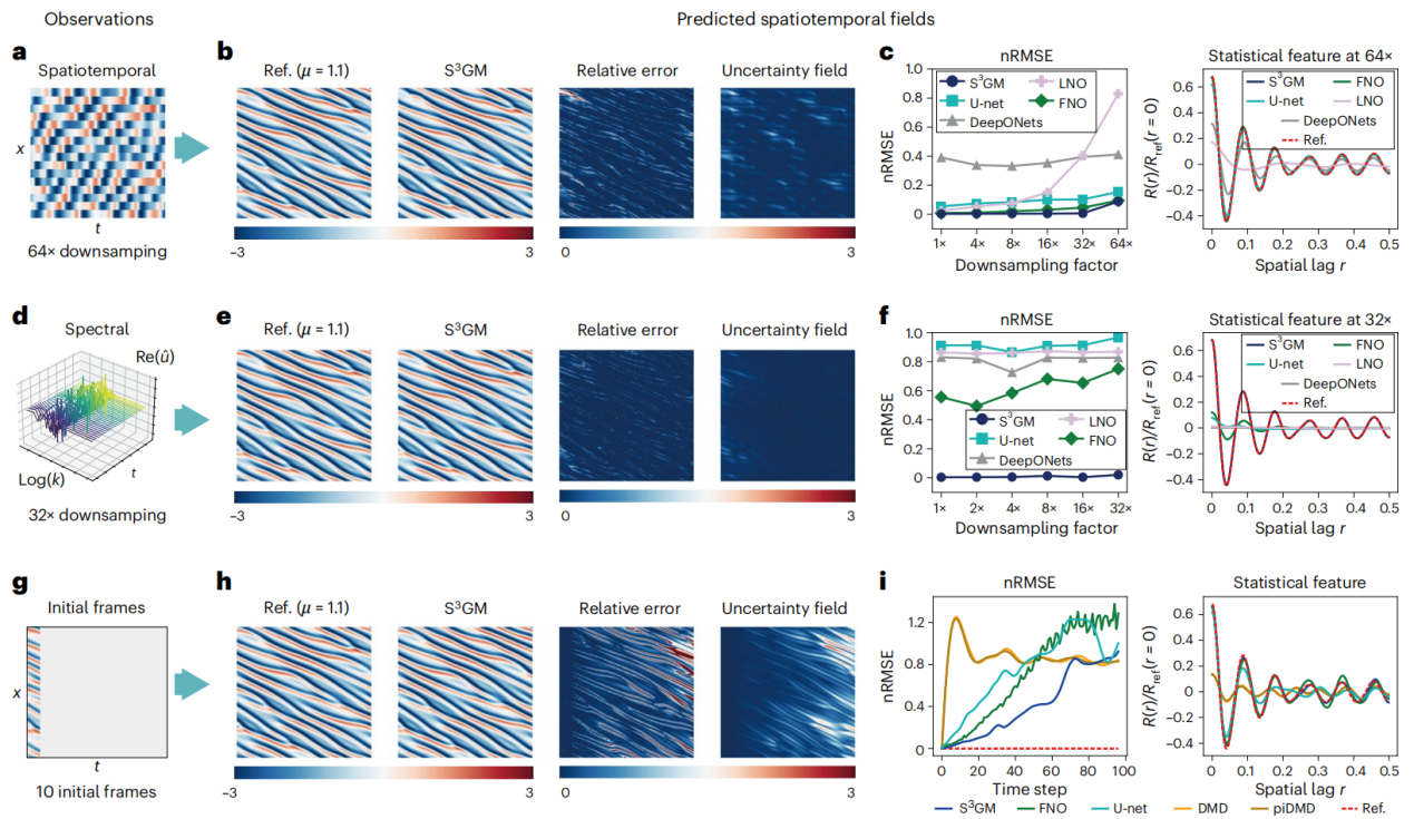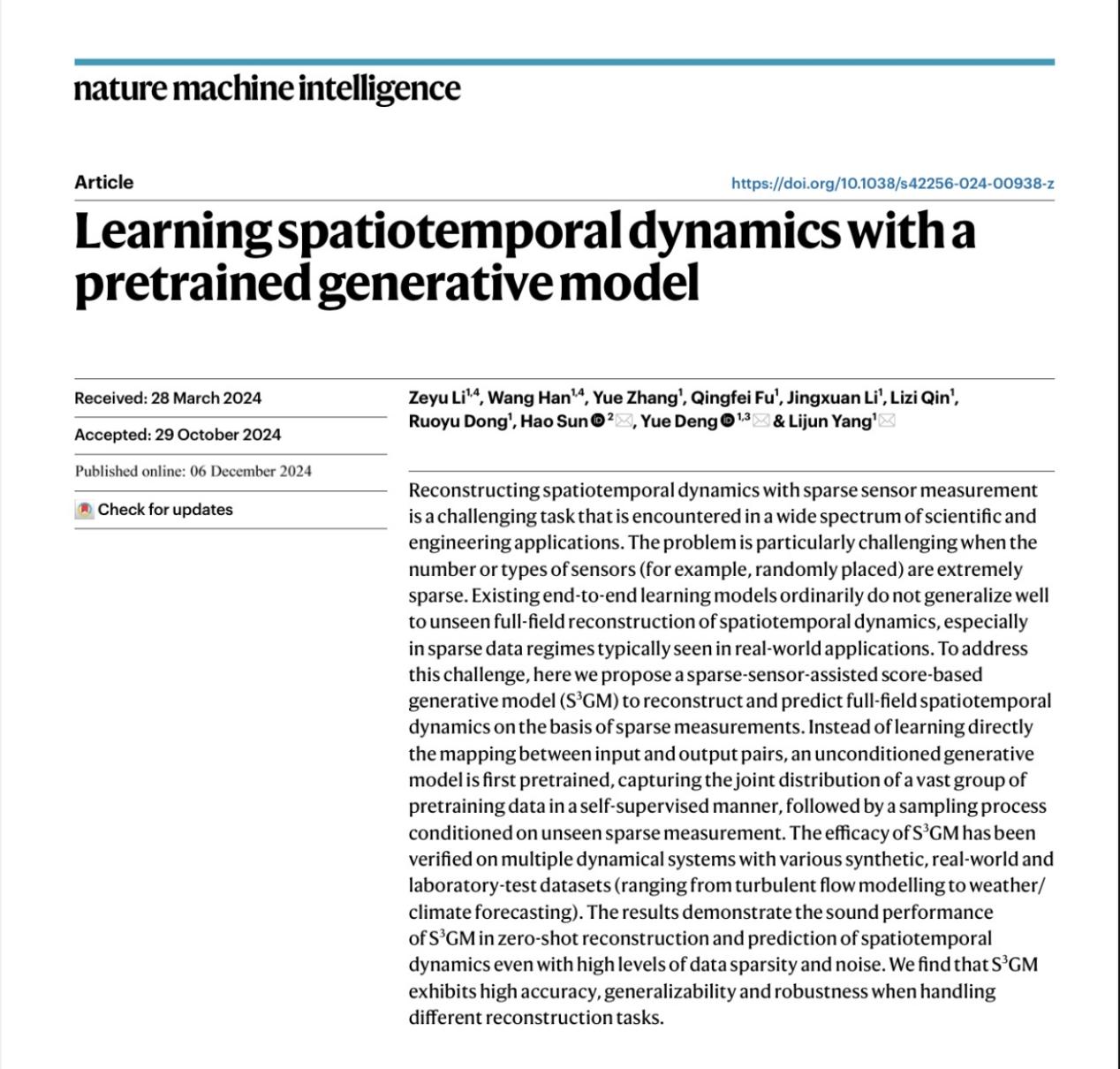 7M体育即时比分 长聘副教授孙浩团队与北京航空航天大学杨立军教授团队合作,在Nature子刊Nature Machine Intelligence(《自然-机器智能》)发表题为“Learning spatiotemporal dynamics with a pretrained generative model”的Article文章,提出了一种基于扩散生成模型的动态系统预测算法,称为 S3GM(Sparse-Sensor-assisted Score-based Generative Model)。该方法融合了物理先验知识与实验测量数据,旨在解决现代科学与工程中的一大关键挑战:从稀疏的传感器测量数据中重建复杂的时空物理场。研究团队展示了 S3GM 即使在数据极为不完整和有噪声的情况下,也能够准确预测燃烧、流动、气候演变及其他众多物理系统的动态过程,为动力系统建模提供了新的思路。文章共同第一作者为李泽宇(北航)、韩旺(北航),共同通讯作者为孙浩(人大)、邓岳(北航)、杨立军(北航)。