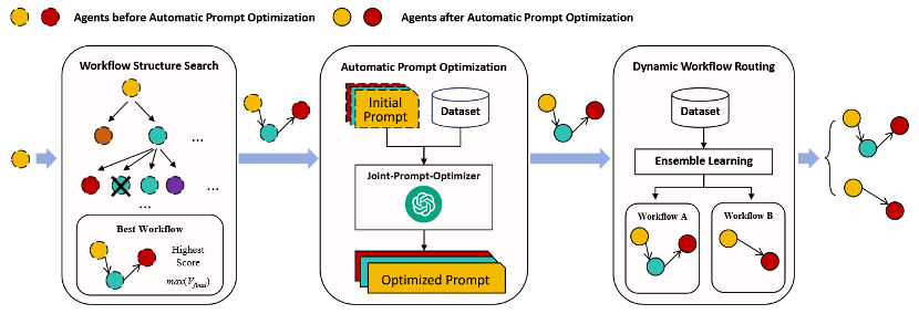 本次获奖成果围绕智能体自动化构建领域的技术难题,共分为智能工作流构建引擎、提示词增强系统、数据智能调度中枢三大部分。具体而言,首先基于工作流搜索算法,实现工作流动态分解与路径优化,让多智能体协作效果显著提升;其次,基于提示词自优化技术构建精准指令链,突破性解决智能体协作中的错误累积难题,增强工作流智能体的最终输出效果;最后,基于数据集路由机制,实现对多源异构数据的推理优化,提升复杂场景泛化能力。相关研究成果已被The Web Conference 会议接收。