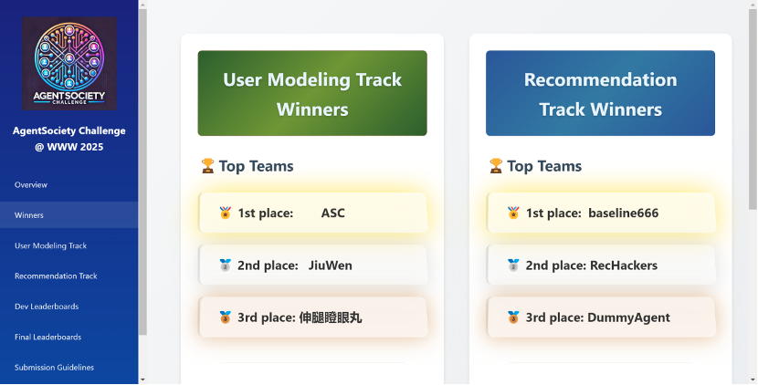 AgentSociety Challenge是The Web Conference 会议为促进人工智能与复杂社会系统融合而设立的国际性赛事,旨在探索智能体在用户行为模拟、用户推荐等场景中的技术边界。本届赛事吸引了来自全球顶尖高校、科研机构及企业共295支参赛队伍报名参赛,其中用户行为模拟赛道和推荐赛道各有20个队伍进入决赛。