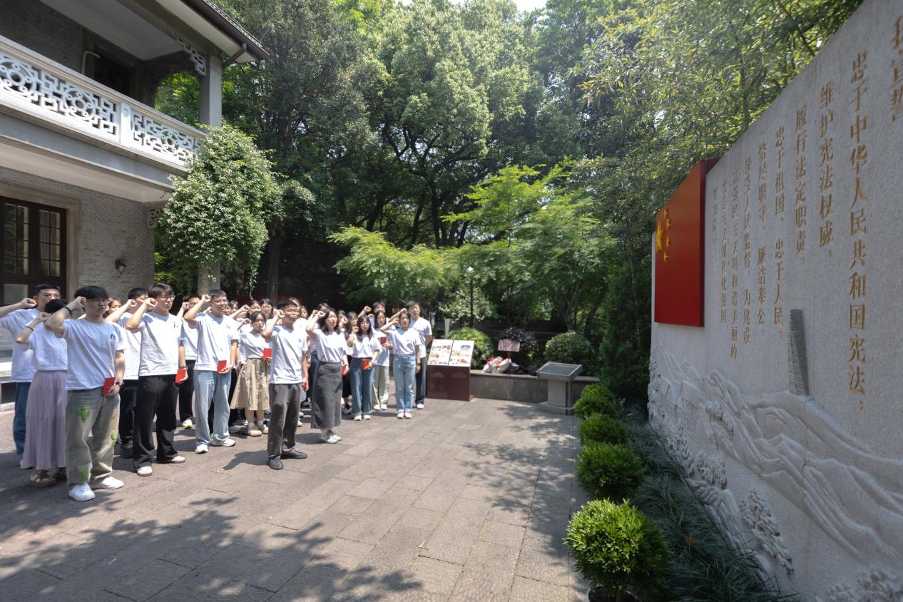 随后,实践队走进“五四宪法”历史资料陈列馆,学习宪法知识,弘扬宪法精神。1953年冬,毛泽东主席在西湖畔的北山街伏案提笔,墨香与湖水的湿气交融,新中国第一部宪法的轮廓在宣纸上渐显。窗外的西湖水波不兴,而宪法草案上的字句却掀起巨浪:“一切权力属于人民”。七十年后,这句话仍悬于馆内的穹顶,如一枚永不锈蚀的印章。