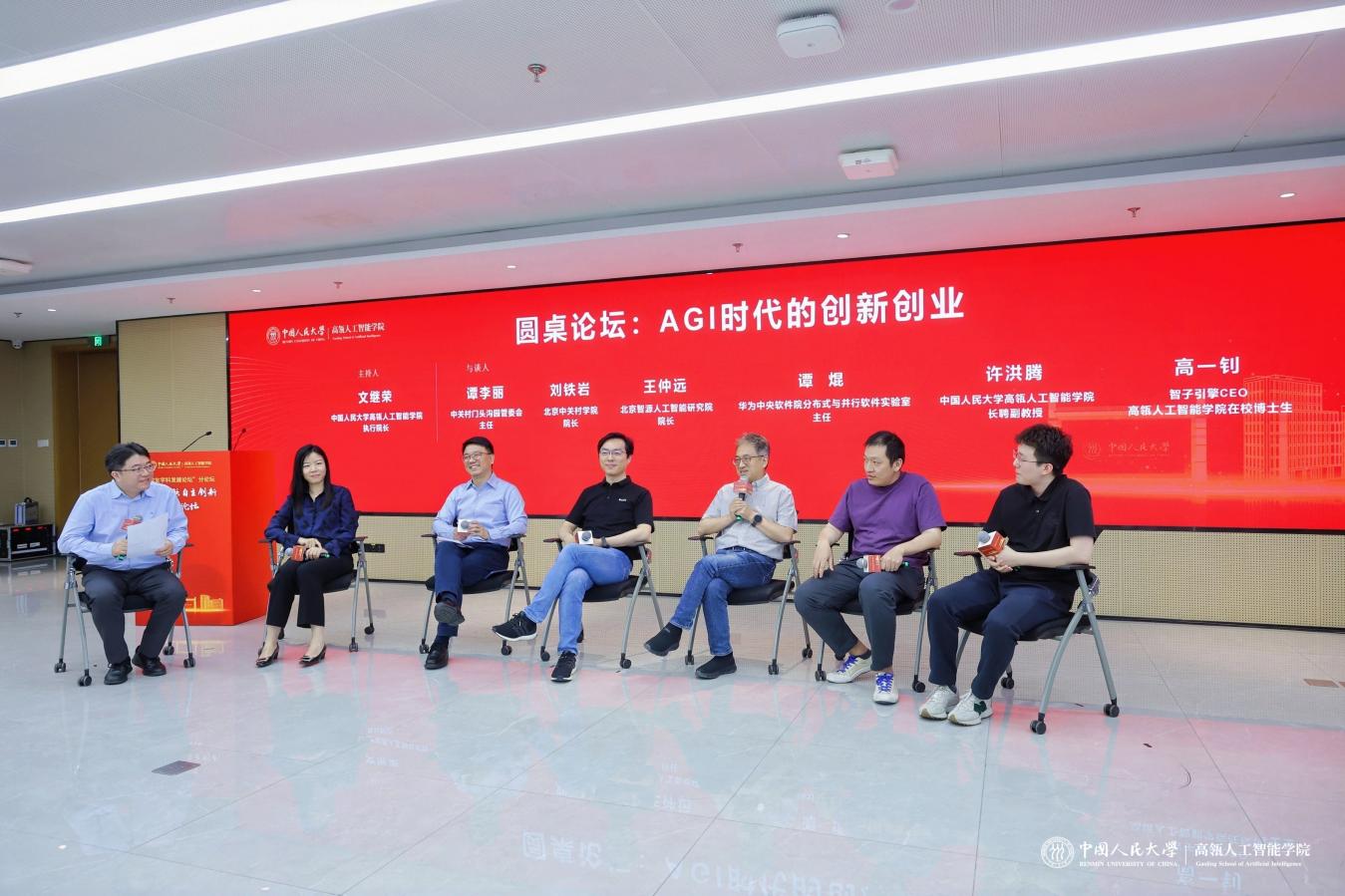 圆桌论坛聚焦“AGI时代的创新创业”,谭李丽、刘铁岩、王仲远、谭焜与教师代表许洪腾、高一钊围绕“如何更好推动青年群体创新创业”等议题进行深入交流。文继荣主持。