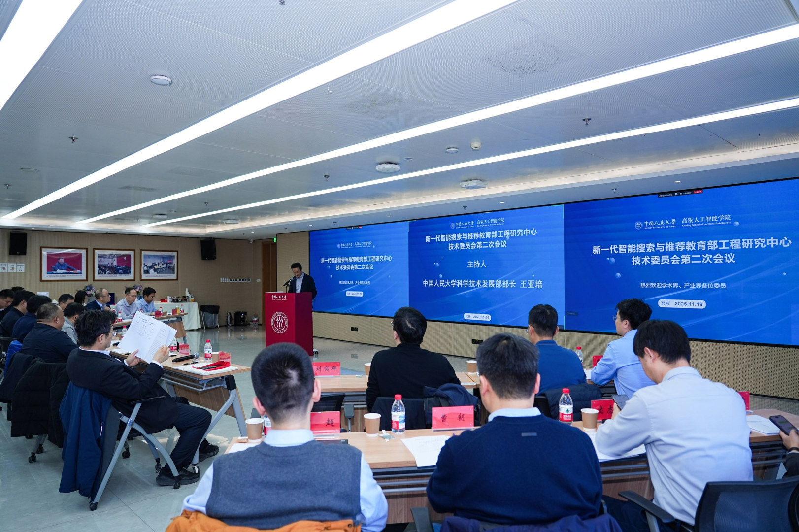 2025年11月19日,新一代智能搜索与推荐教育部工程研究中心(以下简称“中心”)技术委员会第二次会议在中国人民大学立德楼1826多功能厅召开。中国人民大学副校长王小虎出席会议并致辞。会议由中心技术委员会主任、中国科学院院士胡事民,中心技术委员会副主任、学校明理书院院长杜小勇和科学技术发展部部长王亚培共同主持。中心主任、7M体育即时比分 执行院长文继荣,以及来自国内知名院校和科研机构的40余位专家学者参加会议。