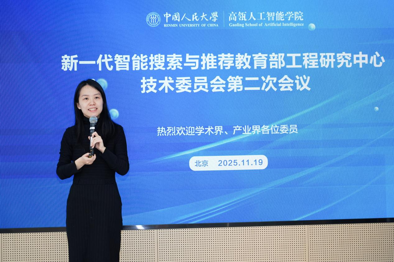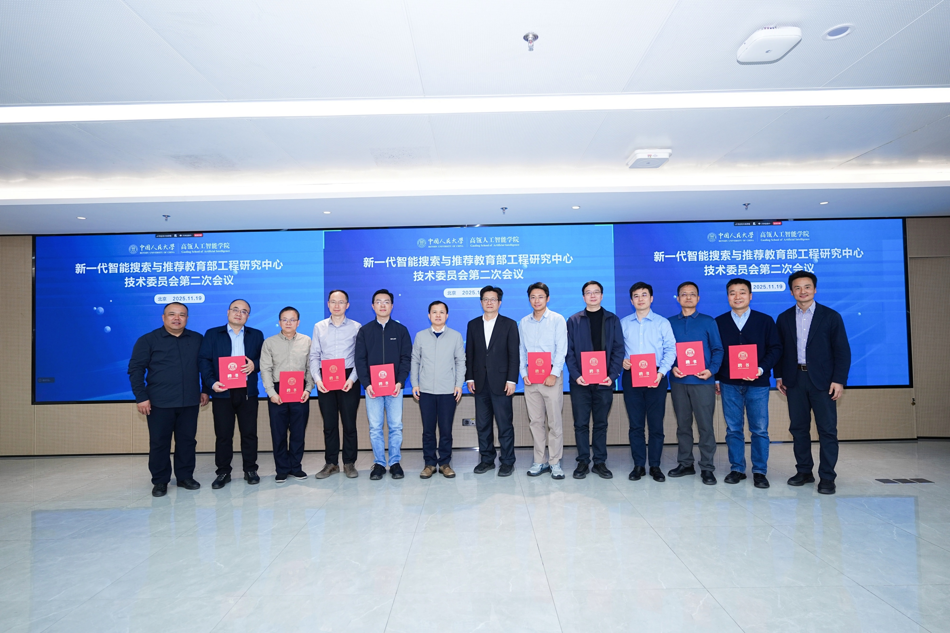 新一代智能搜索与推荐教育部工程研究中心技术委员会第二次会议参会委员(按姓名首字母排序)包括中国科学院院士、清华大学教授胡事民,中国人民大学教授杜小勇,中国人民大学教授曹朝,中国科学院计算技术研究所研究员郭嘉丰,京东集团高级副总裁何晓冬,快手技术副总裁李晗,中国人民大学教授刘品新,清华大学教授刘奕群,联通研究院智能技术研究部总监马瑞涛,OPPO产学研事务部总监秦征,马上消费人工智能研究院副院长史树明,北京智源人工智能研究院院长王仲远。华为泊松实验室项目经理何超、快手技术运营中心负责人高海漩、京东探索研究院学术合作总监孙路等合作单位代表出席会议。与会专家和嘉宾齐聚一堂,围绕中心建设发展的关键议题展开了深入交流,为中心的持续创新与高质量发展积极建言献策。