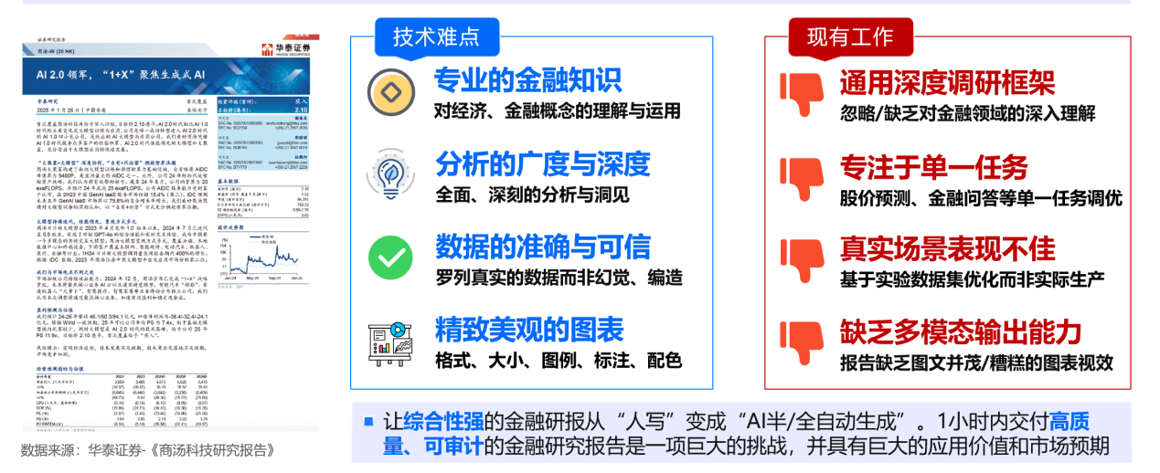 2. 多模态生成能力缺失:金融报告高度依赖图表来传递高密度信息,而现有系统多为纯文本输出,或生成的图表缺乏专业美感与准确性。