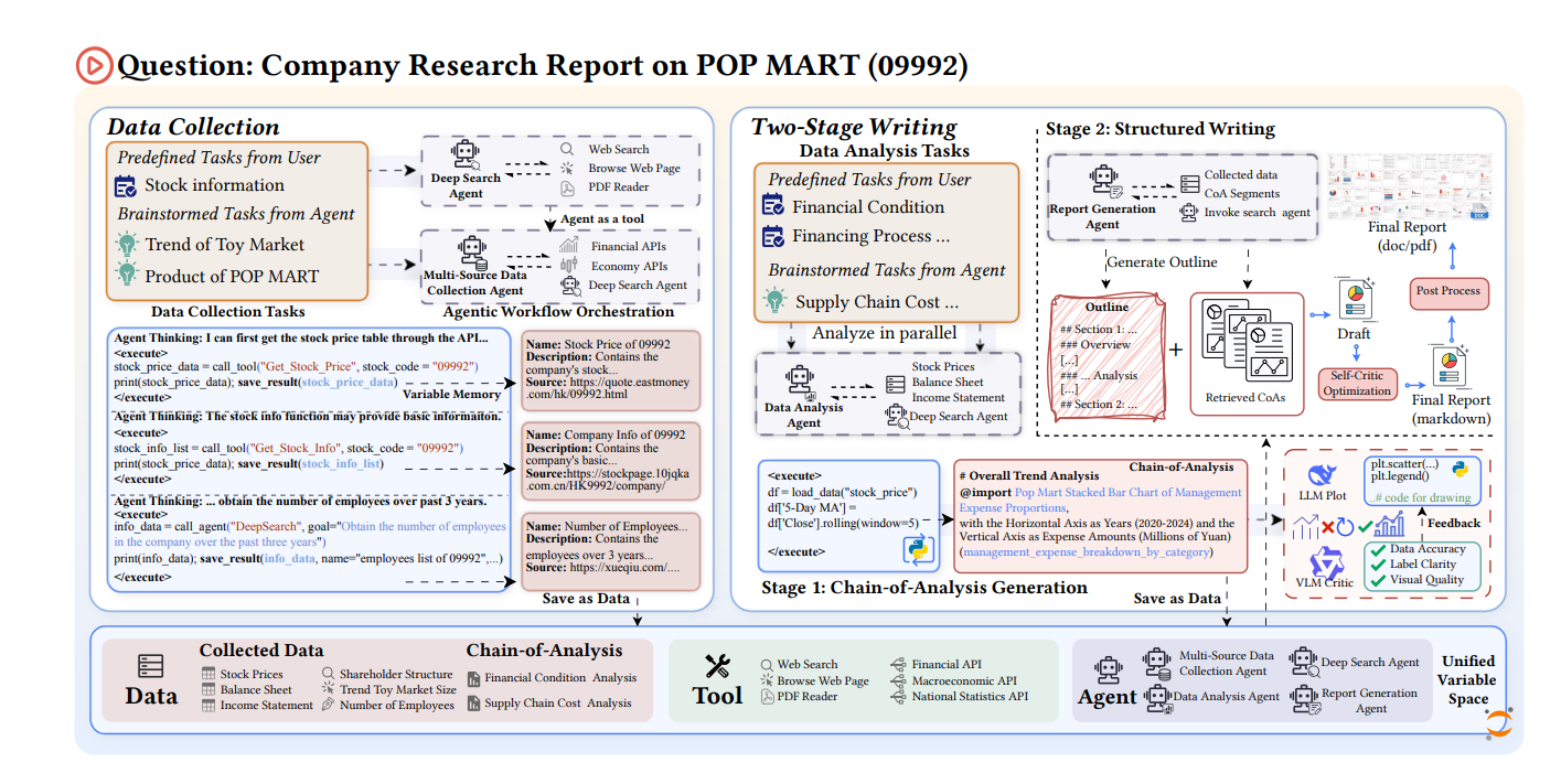 3. 深度写作:双阶段写作框架 (Two-Stage Writing Framework) 为解决长篇报告容易出现的逻辑松散问题,FinSight 采用了“先分析,后写作”的策略。系统首先生成一系列简明扼要、观点鲜明的分析链 (Chain-of-Analysis, CoA)作为核心洞察。随后,报告生成智能体以这些 CoA 和原始数据为基础,利用生成式检索技术,精准地将文本分析、图表展示和数据引用编织成逻辑严密的长篇报告,并引入自我反思机制进行润色,确保报告的深度与连贯性。