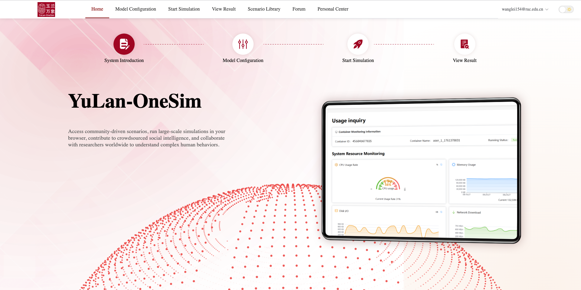 在智能体系统方向,发布支持自动化场景构建的大规模社会模拟平台 “玉兰-万象(YuLan-OneSim)”,用户可通过自然语言逐步描述场景,系统自动生成并执行模拟代码,显著降低社会模拟的开发门槛;推出面向真实投研流程的多模态金融研报生成系统 “玉兰·融观(Yulan-FinSight)”,实现从数据搜集、分析到图文报告生成的端到端自动化;同时提出通用推理智能体 DeepAgent,将“思考—工具发现—行动执行”统一到连贯推理过程中,并通过记忆折叠等机制支撑长时序、多工具调用任务。