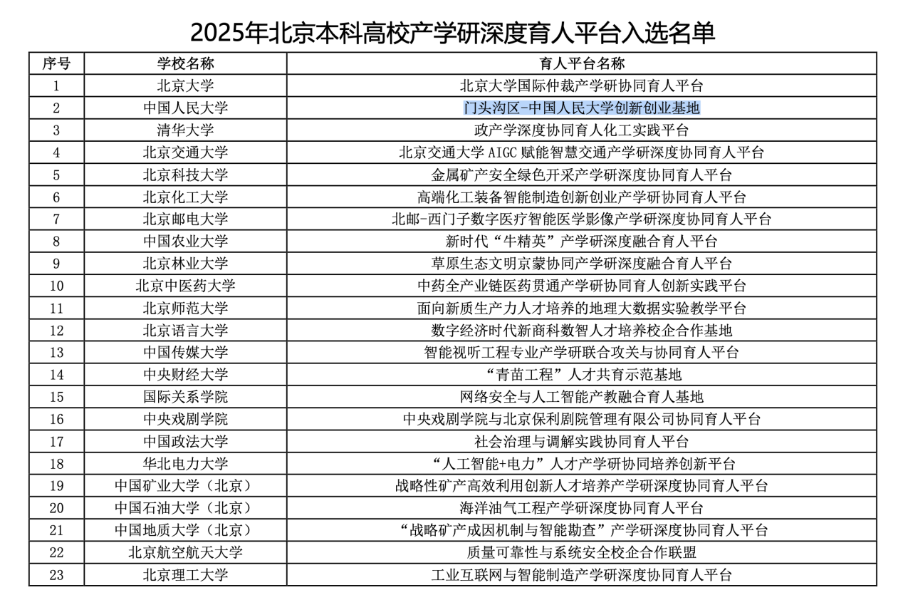 门头沟区 中国人民大学创新创业基地是中国人民大学与门头沟区深化校地协同、推动产学研融合的核心载体,也是学校重点打造的产学研深度协同育人标杆平台和“三创”重要阵地。基地紧扣区域“科技强区”战略和人工智能产业发展方向,依托京西智谷的算力资源、产业生态与政策优势,系统构建起“课程筑基—科研领航—交流拓界—实践赋能—创业孵化—投资对接”的端到端育人链条,为“三创”人才培养提供全流程支撑,推动教育链与产业链精准衔接。目前,基地已在7M体育即时比分 取得积极成效,同时为区域治理提供智能化解决方案,为产业发展持续注入新动能。