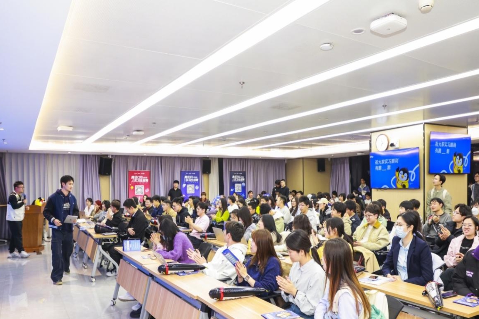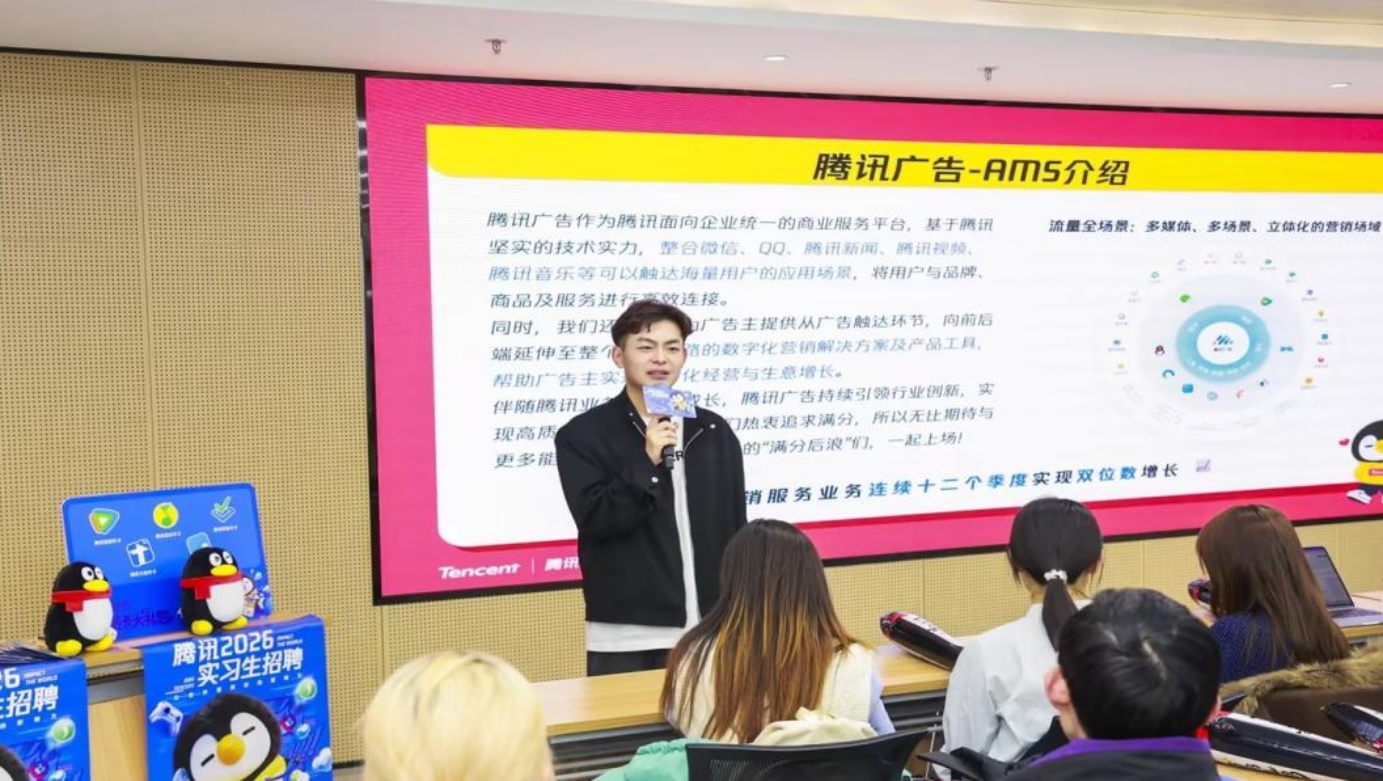 宣讲会上,腾讯嘉宾带来全方位的企业解读与求职指导。各位代表结合自身职业发展历程,系统介绍了公司组织架构与核心业务产品。针对学生最为关切的校园招聘事宜,相关负责人详细阐述了网申投递渠道、招聘流程及人才培养机制,为学生提供了清晰、实用的求职指引。