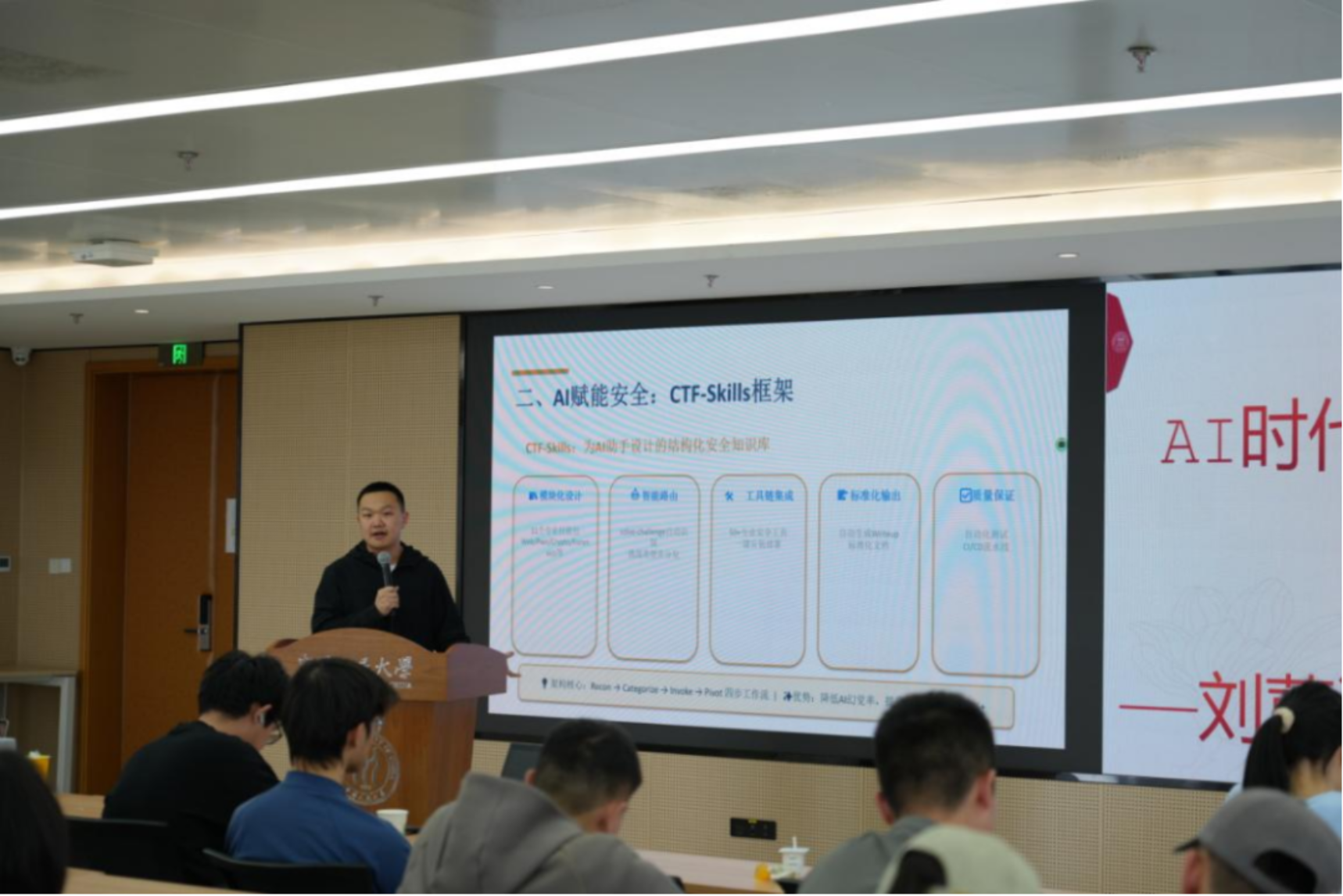 主题分享后,双方聚焦“AI时代网络空间安全”开展专业研讨。中国人民公安大学信息网络安全学院2024级网络安全与执法专业本科生刘蕙源作 《AI时代下网络攻防革新——以MISC为例》 技术分享。他结合人工智能技术发展趋势,剖析了AI赋能网络攻防的变革逻辑与实践要点,体现了青年学子以技术报国、守护网络安全防线的专业自觉。