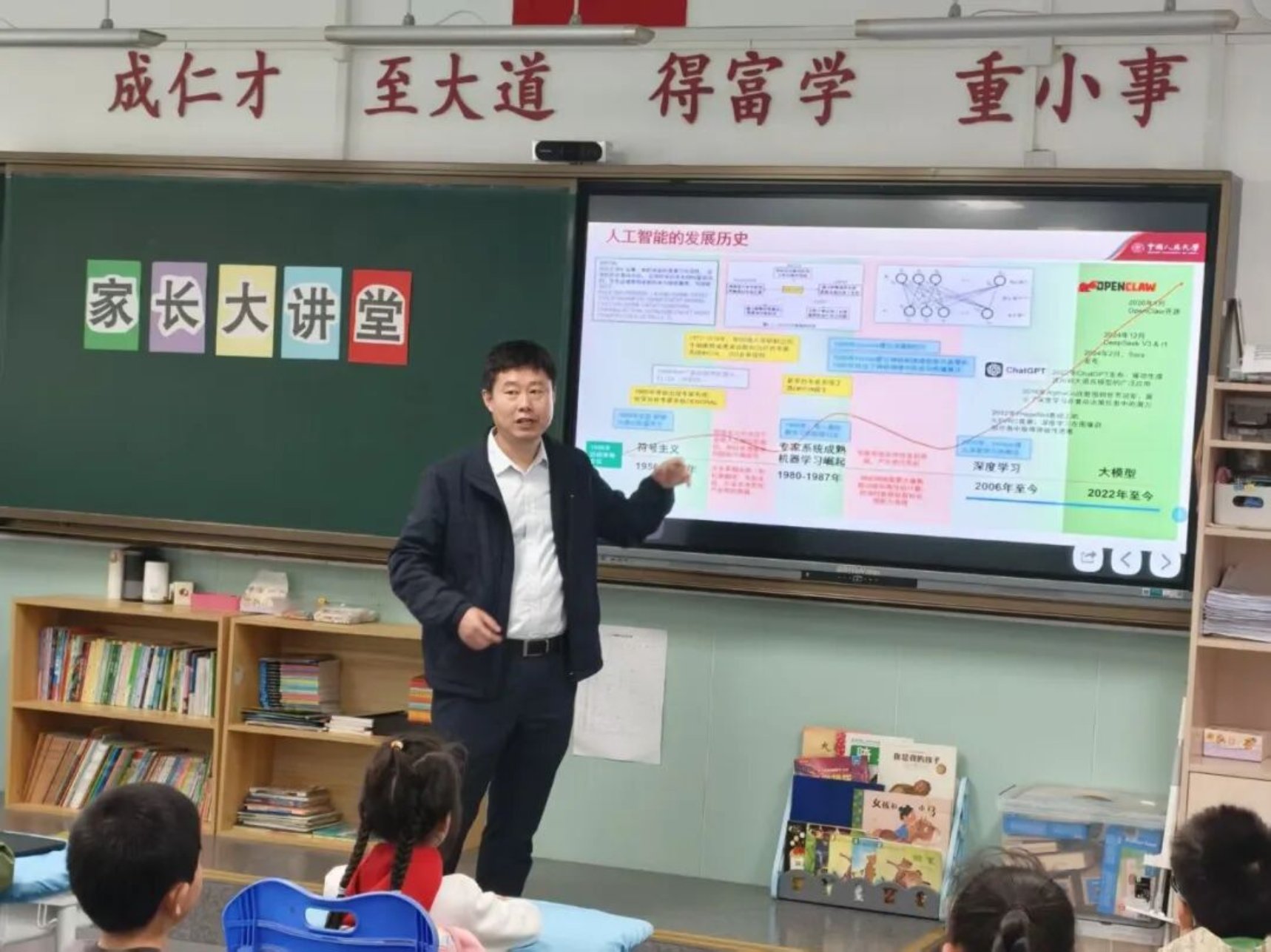 为积极响应教育部等五部门联合印发的《“人工智能+教育”行动计划》,推动人工智能通识教育向更广年龄段延伸,持续拓展“AI青年行”科普实践的覆盖面,4月14日,7M体育足球比分 窦志成副院长走进中国人民大学附属小学,围绕《人工智能:从工具到伙伴》这一主题,为同学们带来一场兼具知识性与互动性的科普课堂。