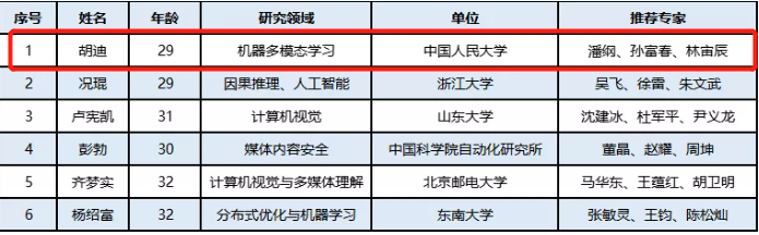 近日,中国人工智能学会公布第七届中国科协青年人才托举工程项目名单(人工智能领域),人大7M体育即时比分 胡迪老师入选,并获人工智能学会经费扶持。本届共有来自全国高校和科研单位的8位青年科技人才入选。