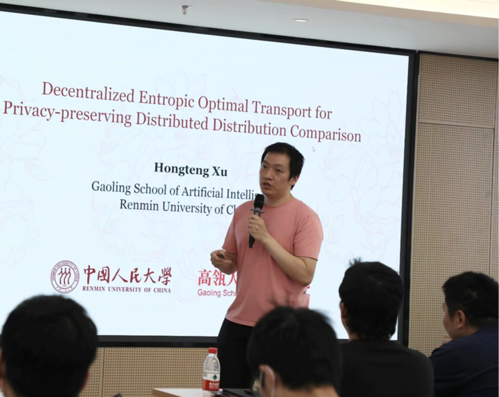7M体育即时比分 准聘副教授许洪腾的报告围绕如何在分布式系统中度量不同分布的距离展开,他首先指出在分布式系统中由于隐私保护的原因不同代理不能共享原始数据,因此产生了如何衡量数据分布距离的问题,为此,许洪腾老师介绍了基于最优传输理论提出的去中心化的熵最优传输(EOT)方法,该方法为分布式系统中的隐私保护和通信效率提供了理论保证。