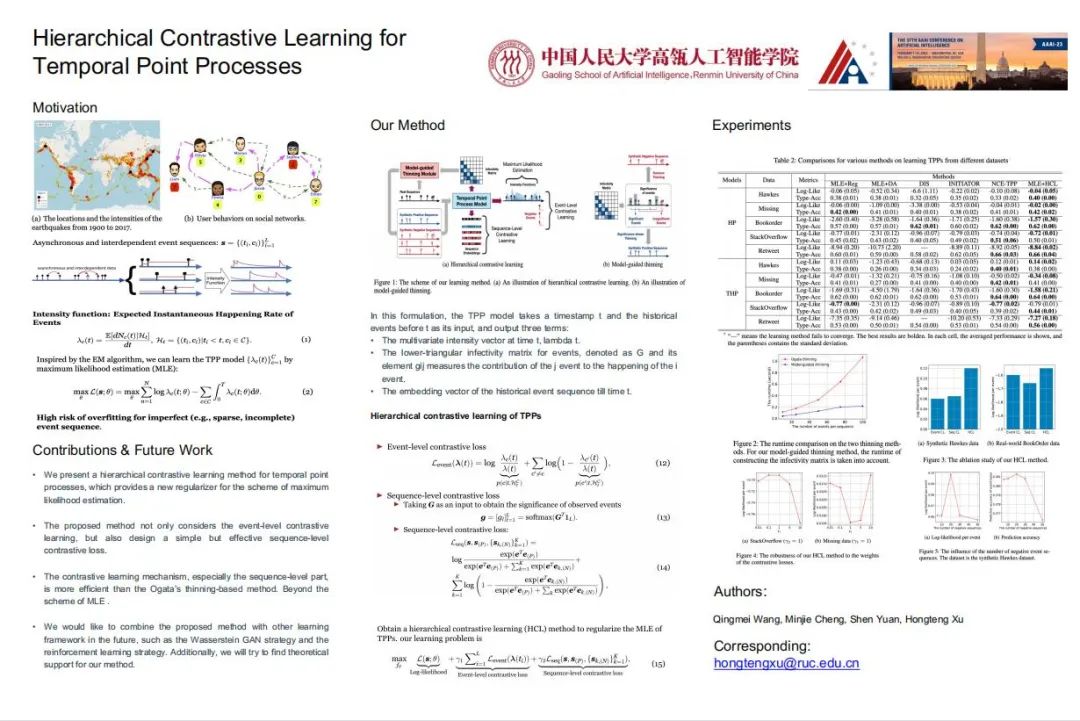 王庆梅的论文Hierarchical Contrastive Learning for Temporal Point Processes也被会议接收为口头报告(Oral Presentation),在主题为“Time-Series& Data Streams”的环节中介绍并分享了该工作。该工作提出了一种层次化对比学习方法(HCL)来缓解时序点过程学习过程中的过拟合问题。HCL同时考虑了事件级和序列级的噪声对比估计问题,此外,在序列级的噪声对比估计中,该工作没有使用耗时的Ogata方法,而是设计一种基于模型的采样方法来生成正负序列,将计算复杂度从O(N^2)降低到O(N)。
